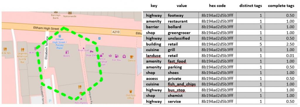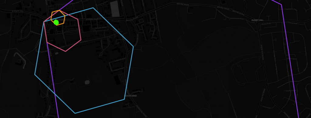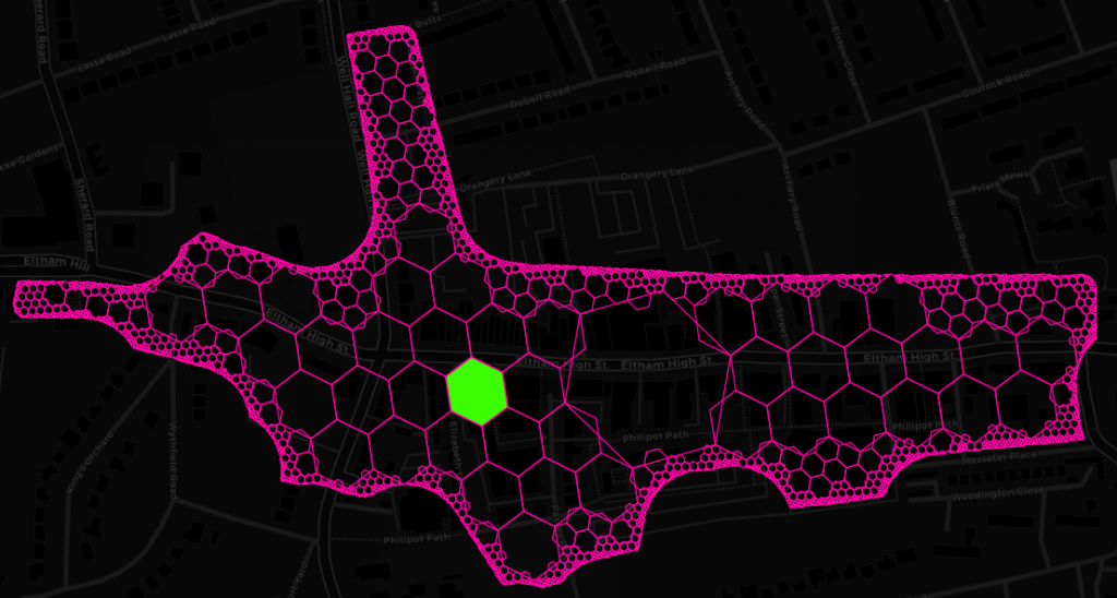 This is what the result of the binning process looks like for a hex cell at resolution 11 on the recently redeveloped Eltham High Street (we got a Nando’s!!!):