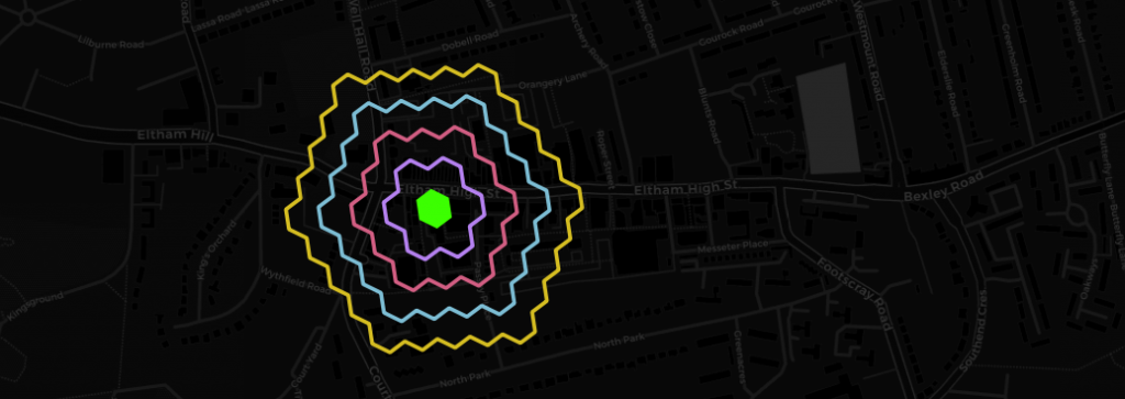 While in this instance we utilized H3 functions for spatial binning, fast neighbourhood aggregation and resolution reduction, there is a whole lot of other potential applications and this is certainly not the last time you will hear us talking about it. Among the things that spring to my mind are geometry simplification of seamless polygon layers, prettifying polygons with mathematical morphology, building cellular automata like the Game of Life (if you are in that sort of thing) and efficient data transfer (e.g. client-server) through compacting. Compacting is one of these really simple but great ideas. All it does is, given a set of hex codes, to replace higher resolution hex codes with that of the parent as long as all children codes are present. Apart from its potential to greatly reduce the amount of space needed to represent any polygon geometry with a specified level of accuracy, it also makes pretty pictures and is the perfect way to finish this post. Here’s said Eltham High Street from Geolytix’s Retail Places dataset compacted down to submeter accuracy.
